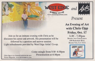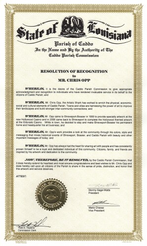 ” … Mr. Chris Opp, the Artistic Shark, has worked to enrich the physical, economic, social and cultural elements of Caddo Parish. Towns and cities are harnessing the power of art to improve their landscapes and build stronger inter-community connections, …”