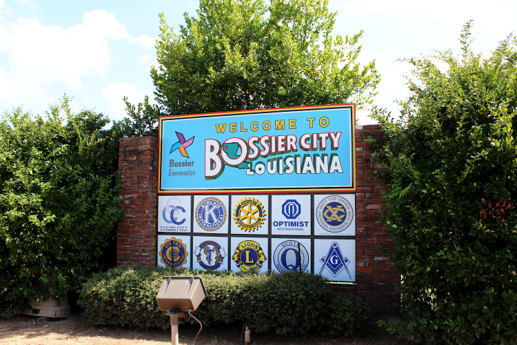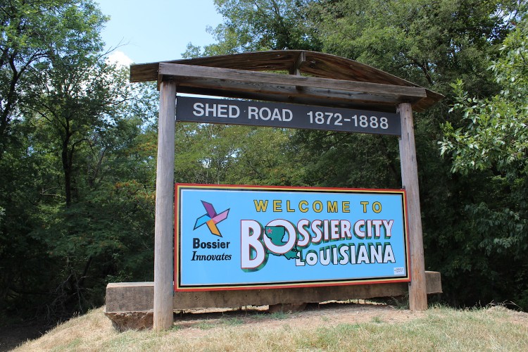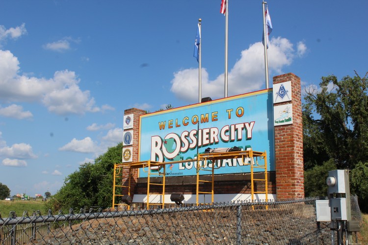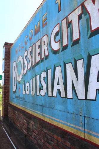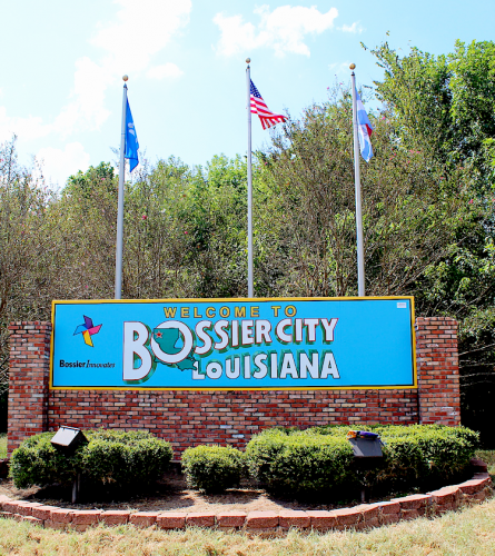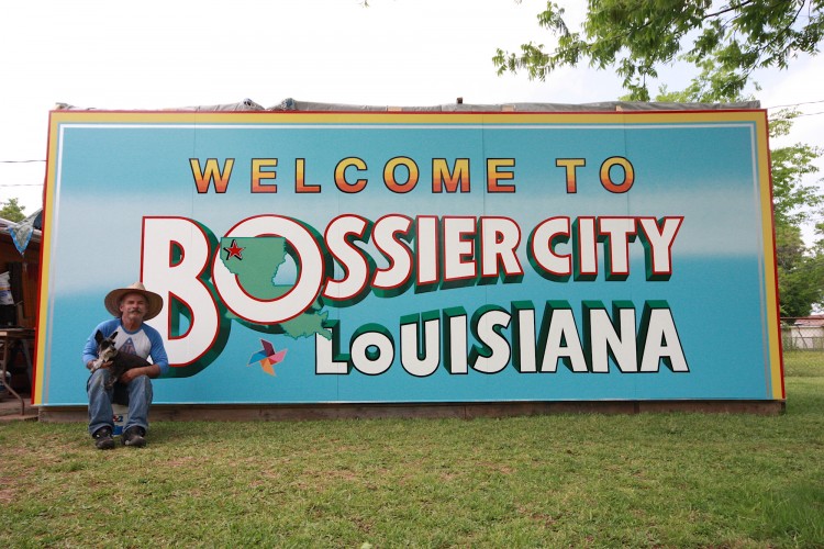 Bossier City, Louisiana is located to the east of its sister-city Shreveport in the Northwest corner of Louisiana. The city is most well known for being the home to Barksdale Air Force Base. Chris created four signs for Bossier City at its main entry points. You will also find images of the signs throughout city affiliated websites, printed images and billboards. The summer of 2019, Chris gave the signs an uplift with fresh paint and color. In the images below you will see the latest updates in the first images, with the original ones following. Also included is a photo of Chris showing off two of his promotional designs for the cities of Shreveport and Bossier at his exhibit during the summer of 2019 in the East Bank District of Bossier City.