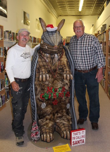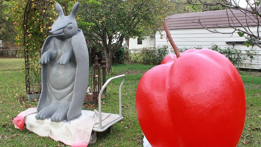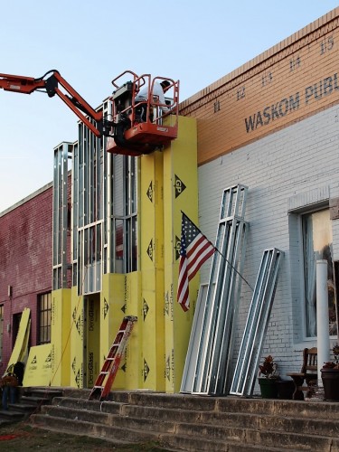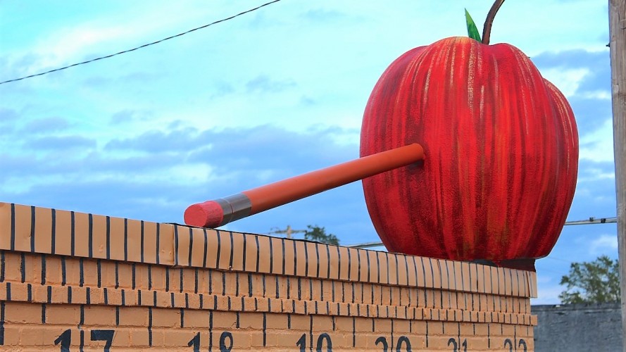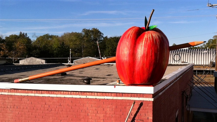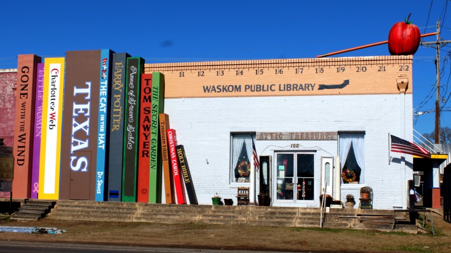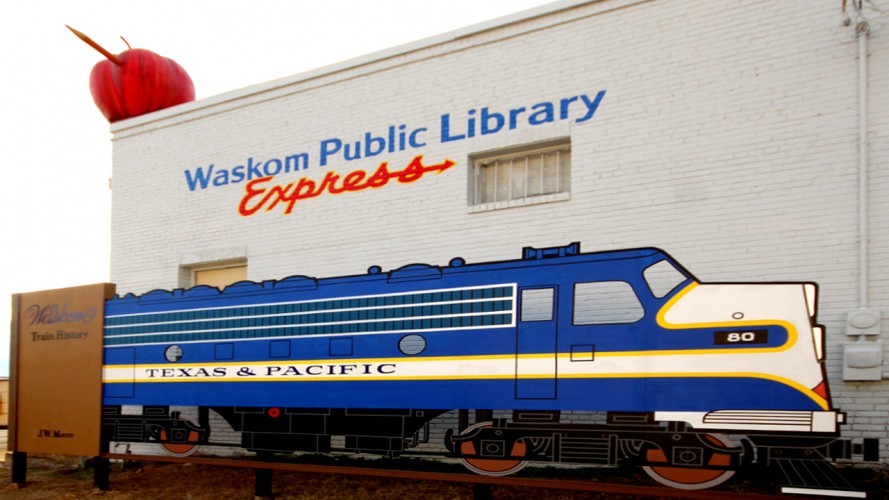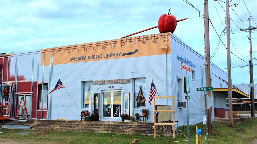 Waskom Public Library has become a focal point of Highway 80 and downtown Waskom, Texas since Chris installed these great works of art. The installation includes a 6 foot Apple with at 20 foot Pencil through it on top of the roof; a dozen 22 feet tall books face Highway 80; and a dedication to the historic Texas-Pacific Railroad that ran through Waskom is located on the side and front of the building that faces the train tracks. This installation was completed in early 2018. Check out this story on the project by KTBS3 on this LINK.