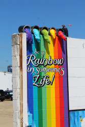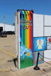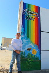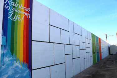 In 2022, the director asked Chris to paint the wall along the parking lot in white so that artists could be selected to paint individual murals as part of a collective. Not only did Chris handpaint all of the black line work, but he was also chosen to paint the first mural. He painted a rainbow with paint cans and a crow sits on the top with a paint brush in his beak.