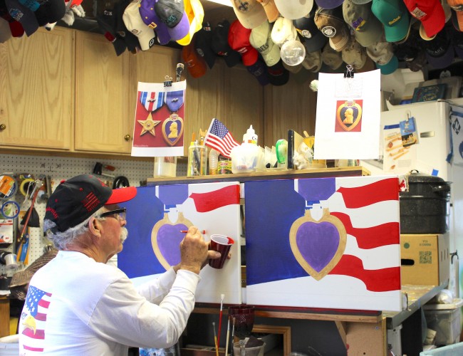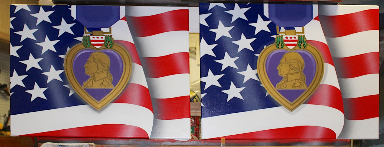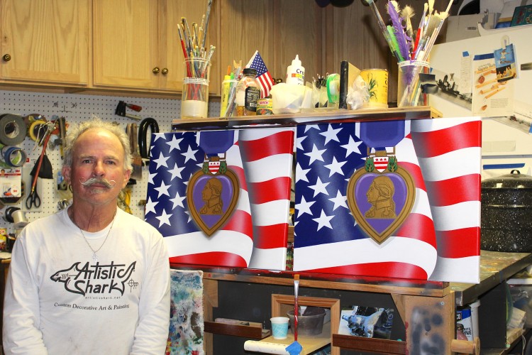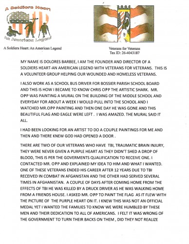 Chris met Dolores Barbee in 2016 after completing a project at a local school. Their conversation moved him to Give Back to some military veterans in a very heartfelt way. Dolores shares, “My name is Dolores Barbee, I am the founder and director of A Soldiers Heart – an American Legend with Veterans for Veterans. This is a volunteer group helping our wounded and homeless Veterans. I also work as a school bus driver for Bossier Parish School Board and this is how I became to know Chris Opp, the Artistic Shark. Mr. Opp was painting a mural on the building of the middle school and every day for about a week I would pull into the school and I watch Mr. Opp painting and then one day he was gone and this beautiful flag and eagle were left. I was amazed. The mural said it all. I had been looking for an artist to do a couple paintings for me and then and there knew God had opened a door. There are two of our Veterans who have Traumatic Brain Injury. They were never given a Purple Heart as they didn’t shed a drop of blood, this is per the government’s qualification to receive one. I contacted Mr. Opp and explained my idea to him and what I wanted. One of these Veterans ended his career after 12 years due to TBI received in combat in Afghanistan and the other had served several times in Afghanistan. A couple of days after coming home from the effects of TBI, he was killed by a drunk driver as he was walking home from a friend’s house. I asked Mr. Opp to paint the flag as it flew with the picture of the Purple Heart on it. I knew this was not an official medal, yet I wanted the families to know we were humbled by these men and their dedication to all Americans. I felt it was wrong of the government to turn their backs on them. Did they not realize that they may not have shed a drop of blood on the outside but the damage to them on the inside was crushing and mentally changing.