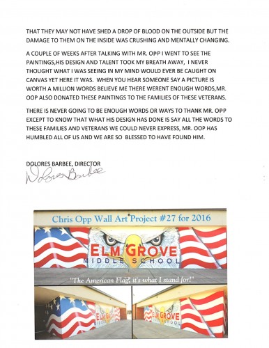 A couple of weeks after talking with Mr. Opp I went to see the paintings. His design and talent took my breath away. I never thought what I was seeing in my mind would ever be caught on canvas yet here it was. When you hear someone say a picture is worth a million words, believe me there weren’t enough words. Mr. Opp also donated these paintings to the families of these Veterans. There is never going to be enough words or ways to thank Mr. Opp, except to now that what his design has done is say all the words to these families and Veterans we could never express. Mr. Opp has humbled all of us and we are so blessed to have found him.”